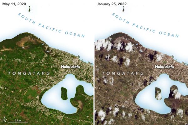 One of the most widespread is volcanic ash. Satellite images collected in the days after the eruption show the fine-grained shards of pulverized rock covering several islands, turning land surfaces from lush green to tan and gray. On January 25, 2022, the Operational Land Imager (OLI) on Landsat 8 captured an image of ash coating much of Tongatapu, Tonga’s most populous island. The closeup images below show the area near Nuku‘alofa before and after the eruption. (Note that the sea water in each image has been masked out in order to focus on land features. The full scene is available for download.)
