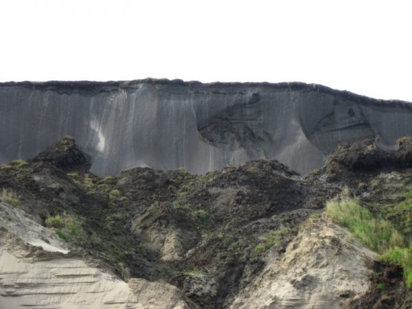 Image: Outcrop of Yedoma sediments with the thick ice masses underlain by river sediments exposed on an arm of the Lena River in the river delta. (Copyright: Janet Rethemeyer)