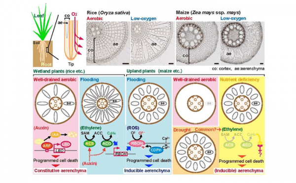 Floods and droughts are the main environmental disasters responsible for most crop failures. Aerenchyma formation can help crops cope with these environmental stresses. However, it is not commonly observed in non-wetland species like wheat and maize, which are staple food crops in certain areas of the world. Researchers Takaki Yamauchi and Mikio Nakazono from Nagoya University, Japan, have surveyed literature on the topic to get a concrete overview of the various factors involved in aerenchyma formation. "If we can genetically control the timing and amount of lysigenous aerenchyma formation in roots of all agronomically important crops, such as maize, wheat and soybean, the global crop production loss could be dramatically reduced," says Dr. Nakazono.
