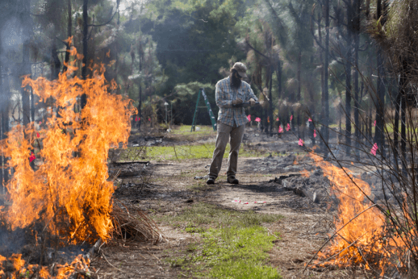 Image: Whalen Dillon recording data in the experiment to assess the effects of invasion, drought, and their interaction on longleaf pine responses to fire. (Credit: UF/IFAS photo by Camila Guillen)