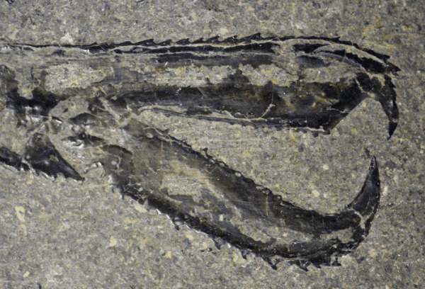 A fossil of a crustacean claw exoskeleton from the Posidonia Shale in Germany. (Photo Credit: Drew Muscente)