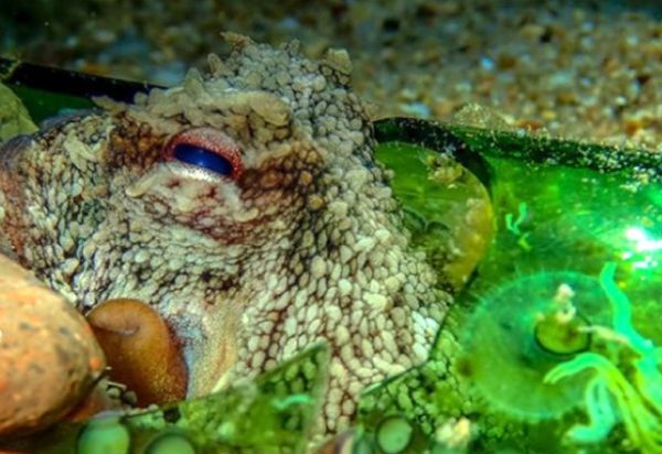 Image: An octopus sheltering in a broken glass bottle. (Photo Credit: John Paul Meillon)