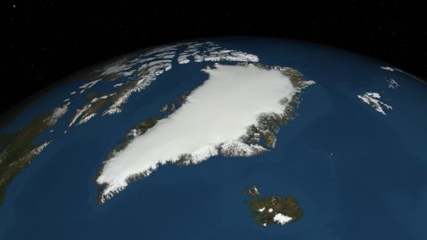 The recent Greenland ice sheet: area 1.8 million km2; mean thickness 1.67 km; volume 7.42 m sea-level equivalent (Photo Credit: NASA’s Scientific Visualization Studio).