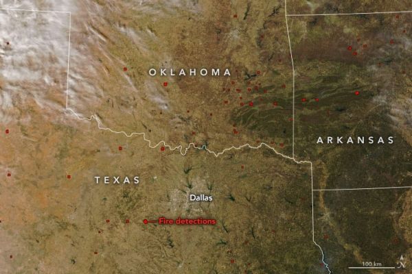 High winds, low humidity, and drought-parched grasses fueled a rash of wildfires in Texas, Oklahoma, and Arkansas in mid-March 2022. According to the Texas A&M Forest Service, at least 178 wildfires have burned more than 108,000 acres across Texas in the past seven days, including one of the largest blazes (by area) in state history. At least three first responders have died in Texas and Oklahoma while responding to the fires.