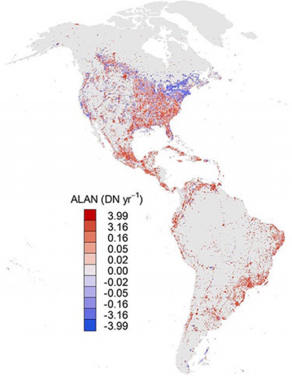Light attracts and disorients birds during migration, often leading to injury and death after collisions with buildings. The authors found that light pollution levels during the past two decades have gone up over roughly 16% of the land area in the Western Hemisphere, with another 7% of land area experiencing a reduction in light pollution. Declines in light pollution are concentrated in the northeastern United States in conjunction with human population declines and urban decay in large cities.