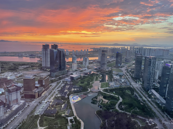 Aerial view of Songdo, Korea, a city collaboratively designed by architects and urban planners as a model for sustainable, high-tech urban living. (Photo Credit: Michael Lepech / Stanford University)