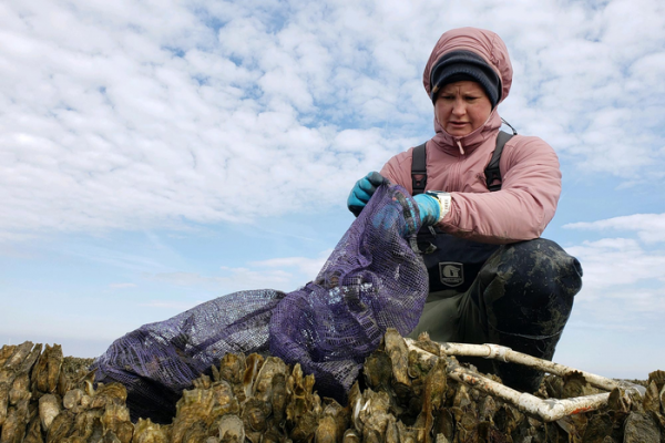 Brittany Collins of The Nature Conservancy measures oysters and crabs on Feb. 10, 2021, on a restored reef in the Hillcrest Oyster Sanctuary. (Photo Credit: Bo Lusk, The Nature Conservancy)