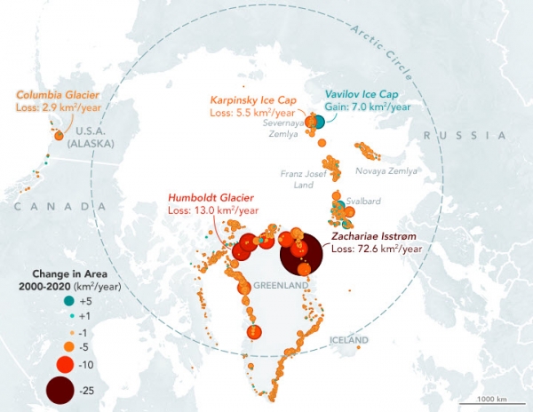 The map above shows where those changes occurred. Areas marked with large red dots lost the most ice, and large blue dots gained the most. Most of the losses (62 percent) come from outlet glaciers along the periphery of Greenland’s enormous ice sheet. Notice the especially large red dot in northeast Greenland. This is Zachariae Isstrøm, which lost 1,453 square kilometers (561 square miles) of ice between 2000-2020.