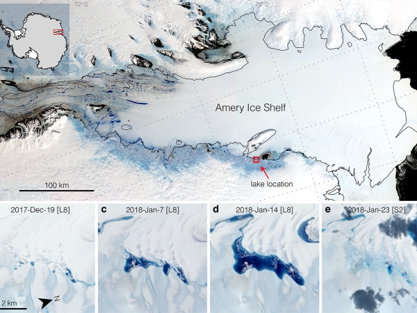 Trusel and his colleagues used satellite data to study a meltwater lake that forms annually at the grounding line of the Amery Ice Shelf in East Antarctica. The grounding line is a zone where land ice transitions to a floating ice shelf that prevents the land ice from flowing into the ocean and raising sea levels. The ice in this area tends to dip and form a basin that could collect water.