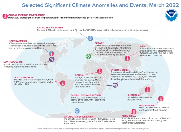 March continued the planet’s exceedingly warm start to 2022, ranking as the fifth-warmest March in 143 years. The year so far ranks as the fifth-warmest globally since 1880, according to scientists from NOAA’s National Centers for Environmental Information. Below are more highlights from NOAA’s latest monthly global climate report: