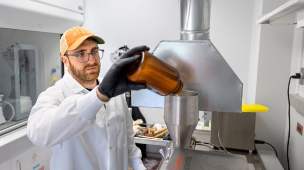 Doctoral student Ian Kay, working in the laboratory of food science professor Julie Goddard, conducts research on biologically derived polymer for packaging to help food last longer. (Photo Credit: Ryan Young/Cornell University)