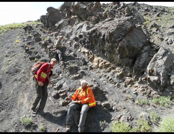 Image: Sedimentary rocks of the Cantwell Formation, representing a prehistoric floodplain environment, are shown in this June 2017 photograph. Dinosaur tracks are visible at the base of the thick, upper sandstone bed. (Credit: Photo by Paul McCarthy)