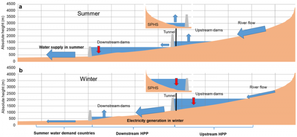 Schematic of the proposed “dual water and energy storage scheme” that can resolve the mismatch between water availability for electricity generation and irrigation. The size of the arrows indicates the amount of water flow in each season. Red arrows show the discharge of water from dams. HPP: hydropower plant; SPHS: seasonal pumped hydro storage. (Photo Credit: Zakeri et al. (2022))