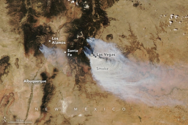 Early season wildfires continued to rage in the first week of May 2022 in northern New Mexico. The blazes have been driven by high winds, low humidity, and exceptionally dry tinder—grass, brush, and timber—that are providing ample fuel for burning. The fires have destroyed hundreds of structures and prompted the evacuation of thousands of homes. On May 3, 2022, seven large fires were still burning across the state.