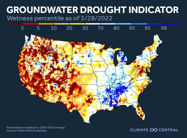 Groundwater storage as of March 28, 2022. Blue areas are wetter than usual, while orange and red areas are drier. (Photo Credit: Climate Central)