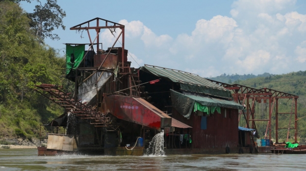 A gold-dredging boat on the Mali River in Kachin State, Myanmar.