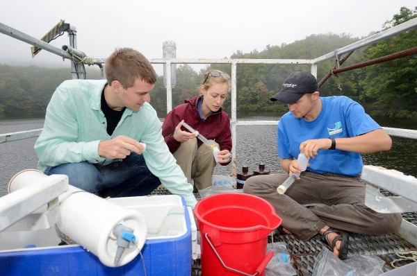 Image: Cayelan Carey, an assistant professor of biological sciences in the College of Science (at center) works with graduate students Jonathan Doubek (at left) and Ryan McClure to filter water samples at Falling Creek Reservoir for analysis of iron and manganese concentrations. (Credit: Virginia Tech)