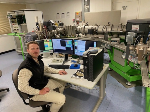Benjamin Urann, who graduated from the MIT-WHOI Joint Program in 2021 and is now a NSF postdoctoral fellow at University of Wyoming, analyzes water in minerals with a secondary ion mass spectrometer at the Woods Hole Oceanographic Institution. (Photo Credit: Ben Urann, © Woods Hole Oceanographic Institution)