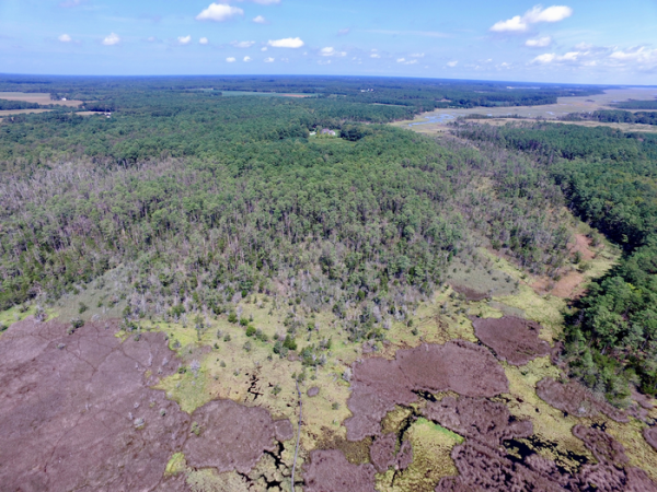 Ghost forests—areas of trees recently killed by rising saltwater—are a clear sign of sea-level rise and marsh migration into rural land. (Photo Credit: Dr. Matt Kirwan/VIMS)