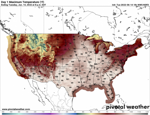Maximum temperatures across the United States for June 14, 2022. White and gray indicate temperatures in the triple digits. (Photo Credit: Pivotal Weather, based on data from the National Weather Service)