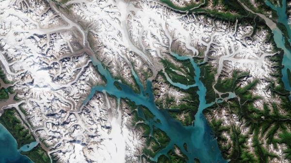 The bay contains some of the world’s most impressive glaciers that descend from the ice-covered St. Elias Range in the east and the Fairweather Range in the west, with a few notable tidewater glaciers extending all the way to the sea.