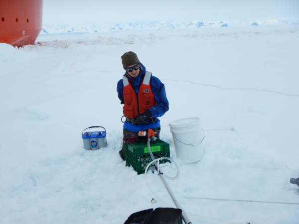 MIT-WHOI Joint Program student Henry Holm pumping seawater for lipid samples from beneath sea ice on the Western Antarctic Peninsula, 2018. This is for a WHOI-led study that conducted a global survey of lipids in the ocean in order to analyze omega-3 fatty acids. (Photo credit: Benjamin Van Mooy / © Woods Hole Oceanographic Institution)
