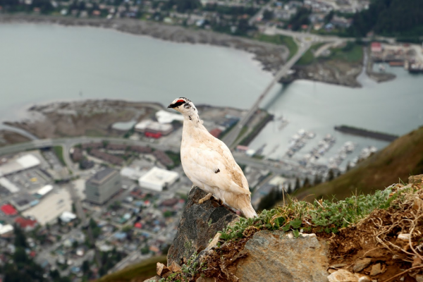 Human activities and infrastructure, such as cities and roads, may reduce future options for species as they need to move to keep pace with climate change. Shown is a willow ptarmigan above a port city. (Photo Credit: Chris Sergeant)