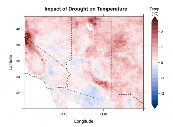 Image: The major drought that happened in 2021 at the same time as a record-breaking heat wave cause the heat to rise by as much as four degrees in parts of the southwest U.S. (Credit: Johns Hopkins University)