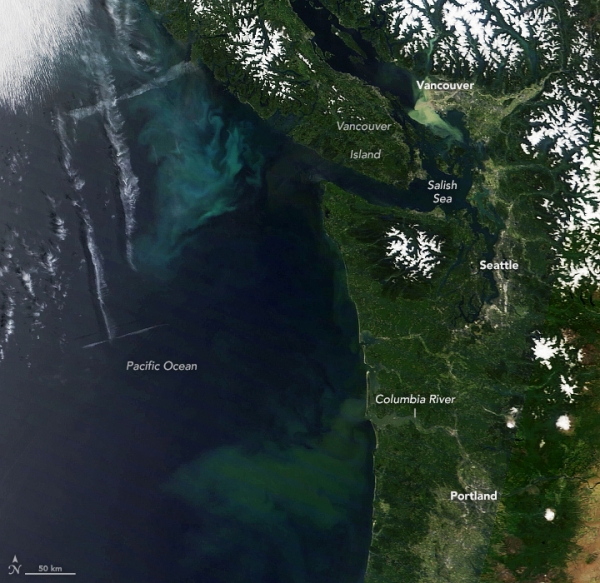 In early summer 2022, a high-pressure system brought warm, clear weather to the Pacific Northwest. The unusually cloud-free skies on June 26 allowed satellites to observe a colorful phenomenon taking shape in the ocean nearby: the proliferation of countless phytoplankton.