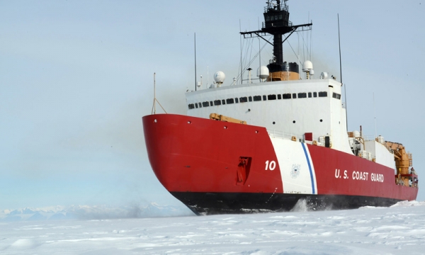 The U.S. Coast Guard (USCG) Cutter Polar Star, pictured carving through ice in this 2017 USCG image, supported the Naval Postgraduate School research team in the field during a detailed study, sponsored by the U.S. Department of Energy and National Science Foundation, into sea ice variability in the Bering Sea and its broader impact to the Arctic region. (Photo Credit: Naval Postgraduate School)
