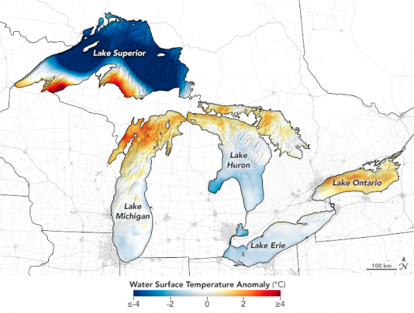 However, in this year of exceptional summer warmth on land—including 90 degree air temperatures across the Upper Midwest—Lake Superior’s water temperatures are running more than 7°F (4°C) below average for this time of year. Such low water temperatures have only occurred twice since 1995.