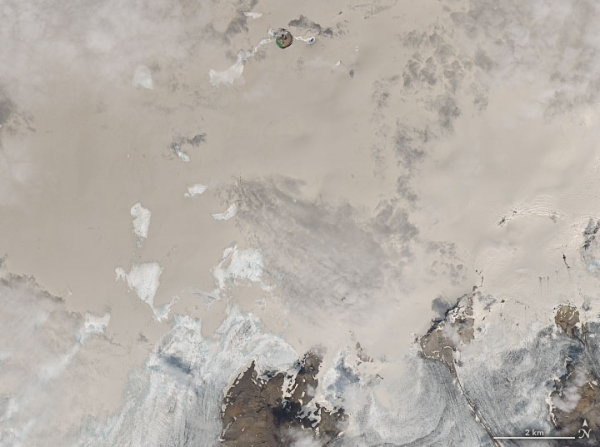 The change is visible in the image pair above, acquired by the Moderate Resolution Imaging Spectroradiometer (MODIS) on NASA’s Terra satellite. On July 2, 2022 (left), the ice cap appeared generally white. Eleven days later, the surfaces of Tungnaárjökull and nearby glaciers had darkened.