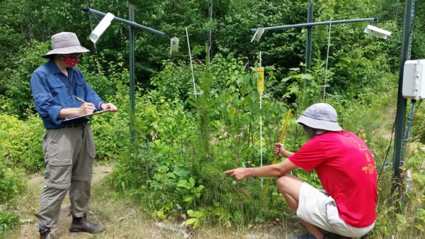 Image: Researchers measure saplings growing on an experimental plot at a University of Minnesota field site in northeastern Minnesota. Photo was taken in July 2020, during the COVID-19 pandemic. (Credit: Raimundo Bermudez, University of Minnesota)