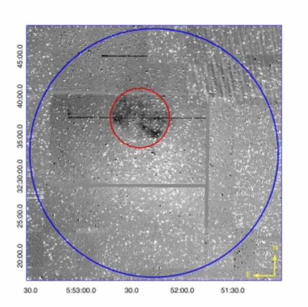 Image: A contrast enhanced 30°ø30 arcminute quotient (Hα−r band) IPHAS (Drew et al. 2005) mosaic centred on the core of Galactic open cluster M 37 (NGC 2099). The low surface brightness bipolar PN (IPHASX J055226.2+323724) is encompassed by a red circle with a diameter of 445 x 10 arcseconds (the nebular major axis) while the blue circle indicates the full ∼ 30 arcminute extent of the cluster. The PN is well within the cluster tidal radius with the blue CSPN at almost the precise geometric centre of the PN. The CSPN is itself only ∼280 arcseconds from the published cluster center position. (Credit: The University of Hong Kong)