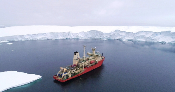 Image: The R/V Nathaniel B. Palmer photographed from a drone at Thwaites Glacier ice front in February 2019. (Credit: Alexandra Mazur/University of Gothenburg)