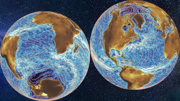 Image: This illustration by Benjamin Storer shows oceanic currents from satellite data overlaid with large scale circulation currents (gold lines) which can be extracted with a coarse graining technique developed in the lab of Hussein Aluie. Note the most energetic of these currents— the Antarctic Circumpolar Current—at lower left. (Credit: Benjamin Storer (Aluie lab at University Rochester))