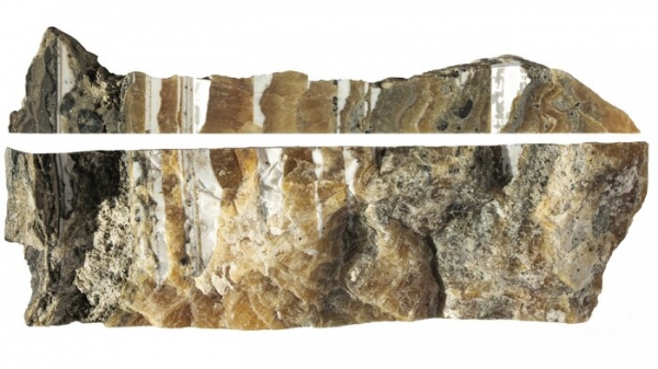 Image: UCSC researchers analyzed two rock samples collected in Eastern Antarctica in which alternating layers of calcite and opal reflect cyclic changes in the subglacial environment. Sample MA113 is 9 centimeters thick and comes from Mount Achernar Moraine on the side of Law Glacier. (Credit: Gavin Piccione)