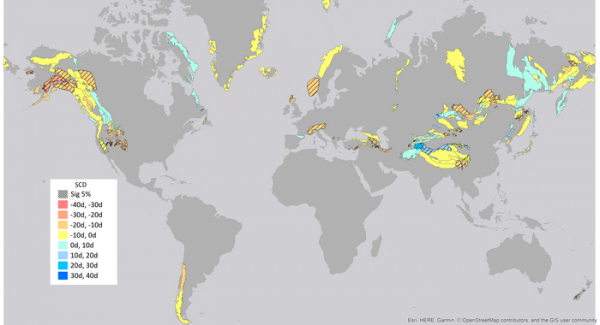 Two years ago, an initial study of global snow cover announced how in 78 percent of mountain areas, snowfall had declined over the past 20 years. To bolster these observations, the same author has now extended the start of data collection to 1982, thus covering a 38-year period up to 2020. "Unfortunately, there are no denials of these trends, only confirmations," explains Claudia Notarnicola, physicist, deputy director of Eurac Research's Institute for Earth Observation and sole author of the study. "With a few exceptions, data on both the extent and duration of snow cover are clearly decreasing." Specifically, there are on average, 15 fewer days that snow remains on the ground, with peaks of 20 or even 30 fewer days in Canada's western provinces (dark orange, figure 1). Coverage has decreased by a total of four percent, which when multiplied by the extent of the areas affected by negative trends (yellow, figure 2) presents an alarming dataset.