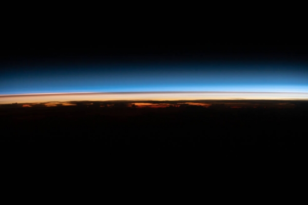 In this photo captured from the ISS in March 2022, the Earth’s limb is shown with a dark thin layer sitting in the bluish color of the stratosphere. This dark thin layer is remnants of the Tonga volcanic plume, lingering in Earth’s stratosphere months after the eruption that occurred in January 2022.