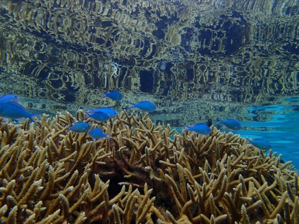 Image: Bright blue Chromis fish on acropora coral at a back reef on the French Polynesian island of Mo’orea. (Image credit: Kelly Speare)