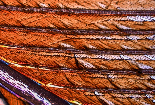 Image: Oil-damaged Manx shearwater features under a digital high-powered microscope. The microstructure within the feather clumps together after exposure to oil, letting water pass through more easily. (Credit: University College Cork)