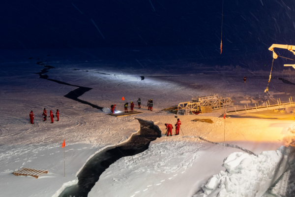 Scientists working on the MOSAiC ice floe in the Arctic Ocean. (Photo Credit: Marcel Nicolaus / Alfred-Wegener-Institute (AWI))