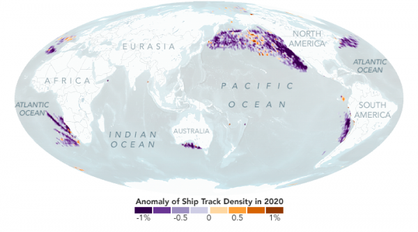 Ship tracks fell significantly in 2020, due to new fuel regulations and the COVID-19 pandemic, according to a new NASA study. (Photo Credit: NASA Earth Observatory)