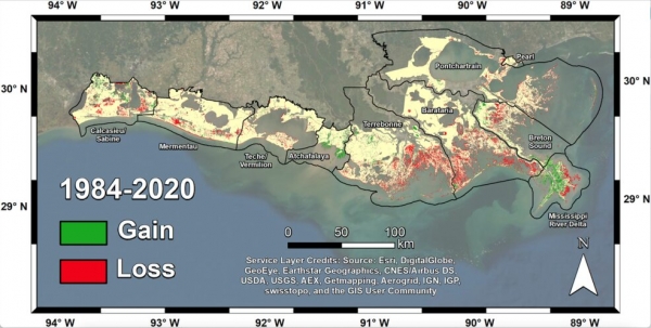 Image: Researchers mapped land change in coastal Louisiana from 1984 to 2020. Basins that failed to build new soil, such as Terrebonne and Barataria, experienced the most land loss -- more than 180 square miles (466 square kilometers). (Credits: Jensen et al. Journal of Geophysical Research: Biogeosciences)