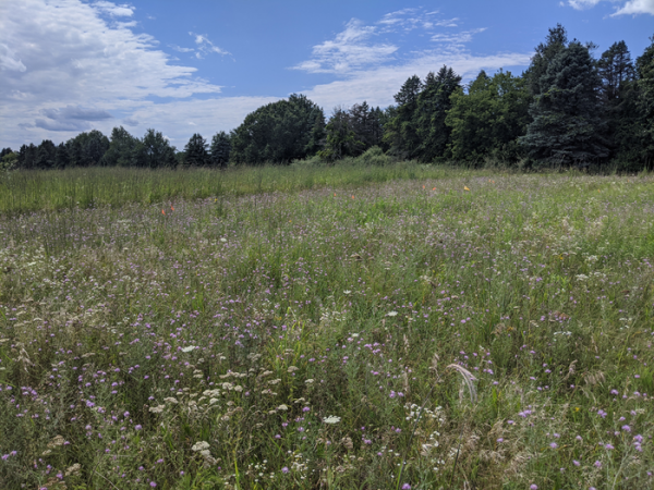 The experimental site Arbor Luxe Reserve let the MSU team investigate how planting year affected the trajectory of restored prairie. Native big bluestem grass is visible in the back, standing taller than the purple flowers of spotted knapweed in the front, which is native to Europe and generally considered invasive in North America. (Photo Credit: Lars Brudvig)