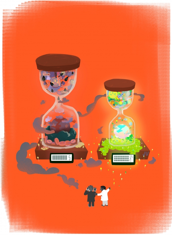 Image: A new study suggests that building infrastructure for cleaner energy generation will by itself create carbon emissions, but the faster it happens, the fewer they will be. (Illustration by Julie Morvant-Mortreuil)