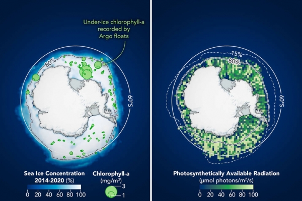 Image: Based on data from underwater instruments and climate models, the left map shows the location and abundance of likely phytoplankton blooms and their position within the icepack from 2014-2020. The right map combines satellite data and models to show where there was likely enough light penetrating the ice to sustain blooms. (Credits: NASA Earth Observatory/Joshua Stevens)