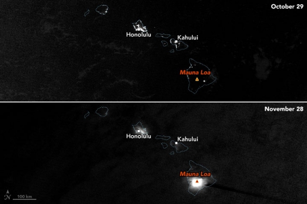 The bright glow of the eruption was visible to NASA and NOAA satellites orbiting hundreds of miles above the surface. The image above was acquired at 2:25 a.m. local time (12:25 UTC) on November 28 by the “day-night band” of the Visible Infrared Imaging Radiometer Suite (VIIRS) on the NOAA-NASA Suomi NPP satellite. For comparison, the image above shows the same area on October 29, 2022, before the eruption had begun.