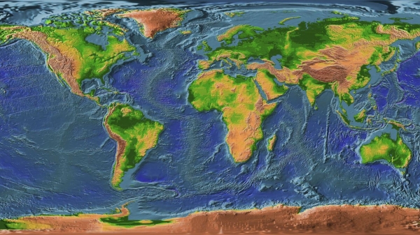 Topographical map of the world, with higher mountain ranges in dark brown and lower areas in green. The Northern Hemisphere has more land mass and higher mountains than the Southern Hemisphere, which contributes in part to fewer storms, according to a new study. (Photo Credit: NASA Jet Propulsion Laboratory)