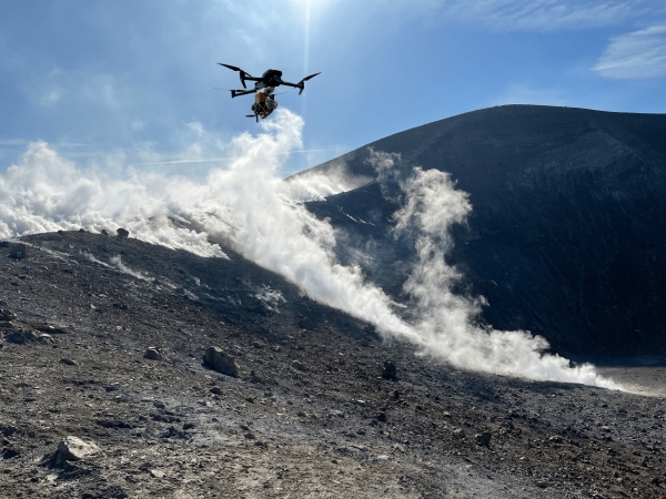 Image: The research drone in action on the island of Vulcano at the southern boundary of the Aeolian Islands (Credit: Johannes Gutenberg Universitaet Mainz)